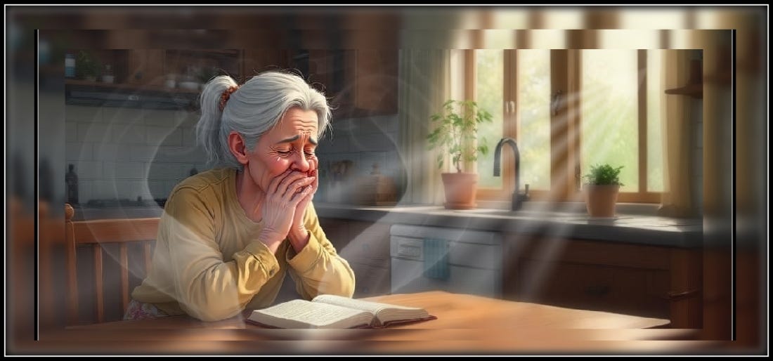 A single tear slipped from the old woman’s face and landed before her on her Bible. She did not notice it. Her frail elbows rested on the wobbly kitchen table, yet her spirit soared into the quiet, ethereal realms of heaven. There she longed to be, in fellowship with her Lord and Master.