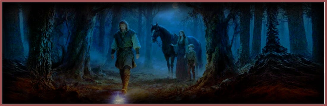 “Not quite,” Calen said. “There!” He instinctively pointed toward the mysterious glow and dismounted from Hosanna. Cautiously, he walked toward the light at the edge of the path. As he drew nearer, his heart leapt. There, clearly visible in the damp earth between brambles and moss-covered stones, was the glowing shape of a footprint, and it seemed to point deeper into the forest.