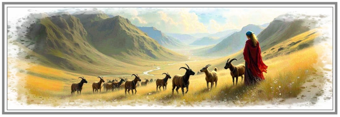 Staying low, in case the hooded man was still nearby, Calen crept further to the top of the hill. And there, just ahead, no more than fifty yards away, a broad herd of goats grazed peacefully, their bells jingling softly. A woman no older than he, was guiding them, moving with quiet confidence among the animals.